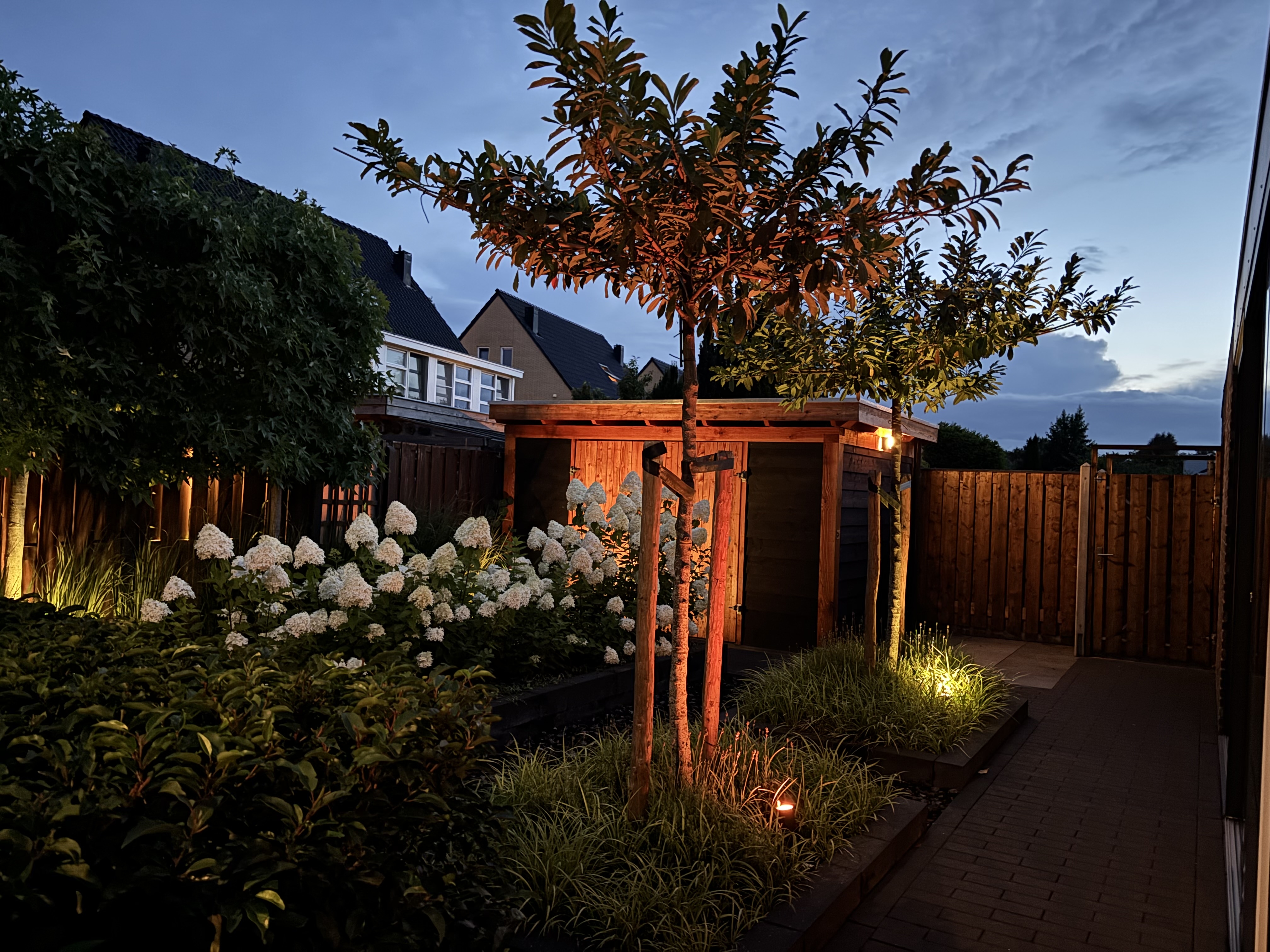 De tuin is in 2023 volledig opnieuw aangelegd en biedt meerdere terrassen. De veranda/tuinkamer maakt dat je hier bijna het hele jaar door van buiten kunt genieten. Verder is er een houten berging (11 m²) aanwezig voor fietsen en tuingereedschap.
