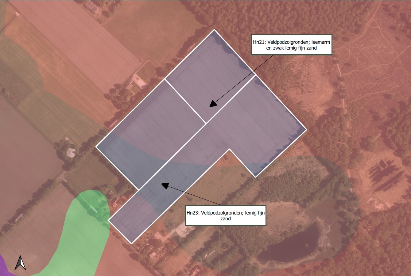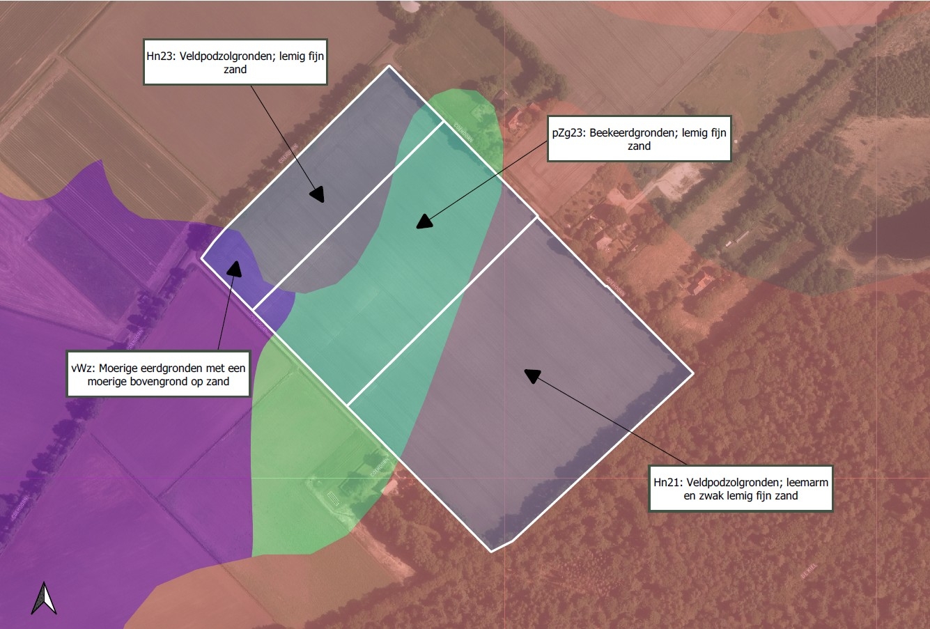 Grondsoorten betreffen voornamelijk veldpodzolgronden (Hn21/Hn23) en deels beekeerd- en moerige gronden.