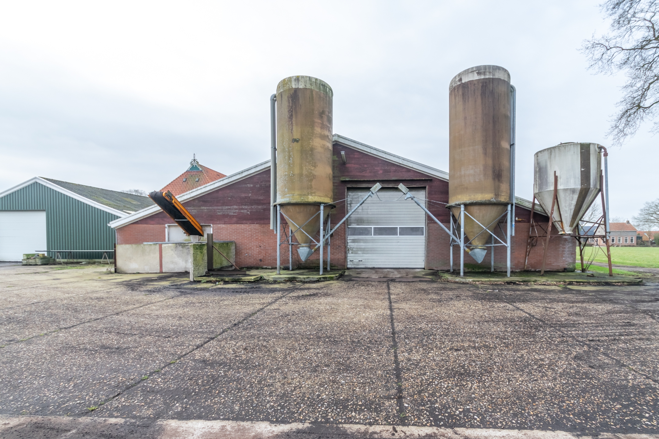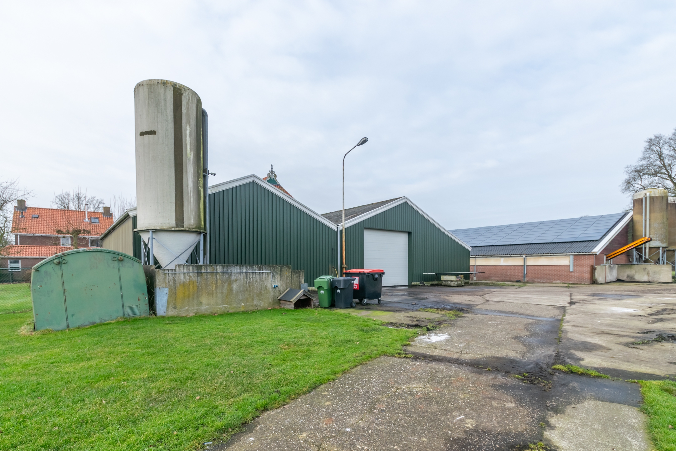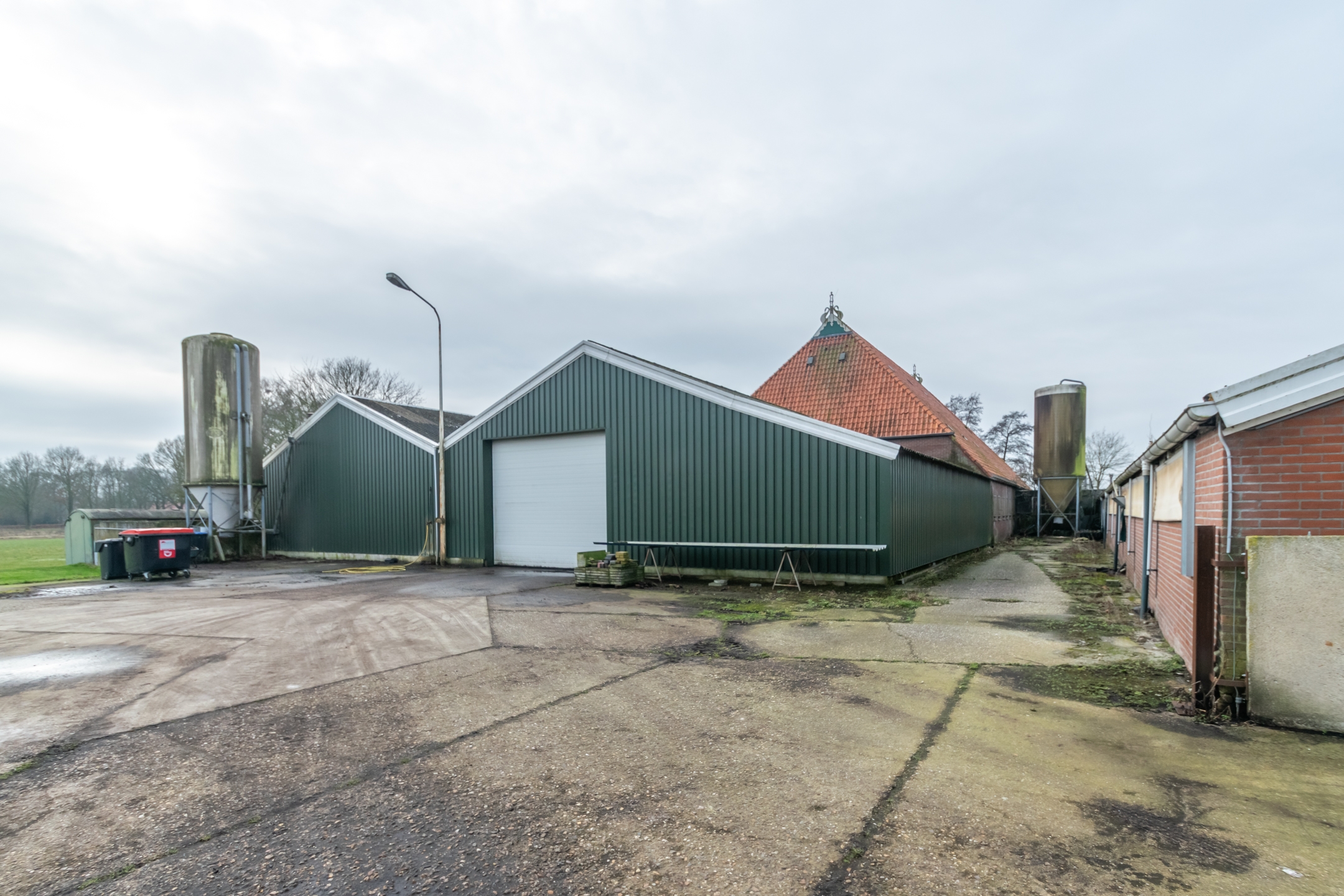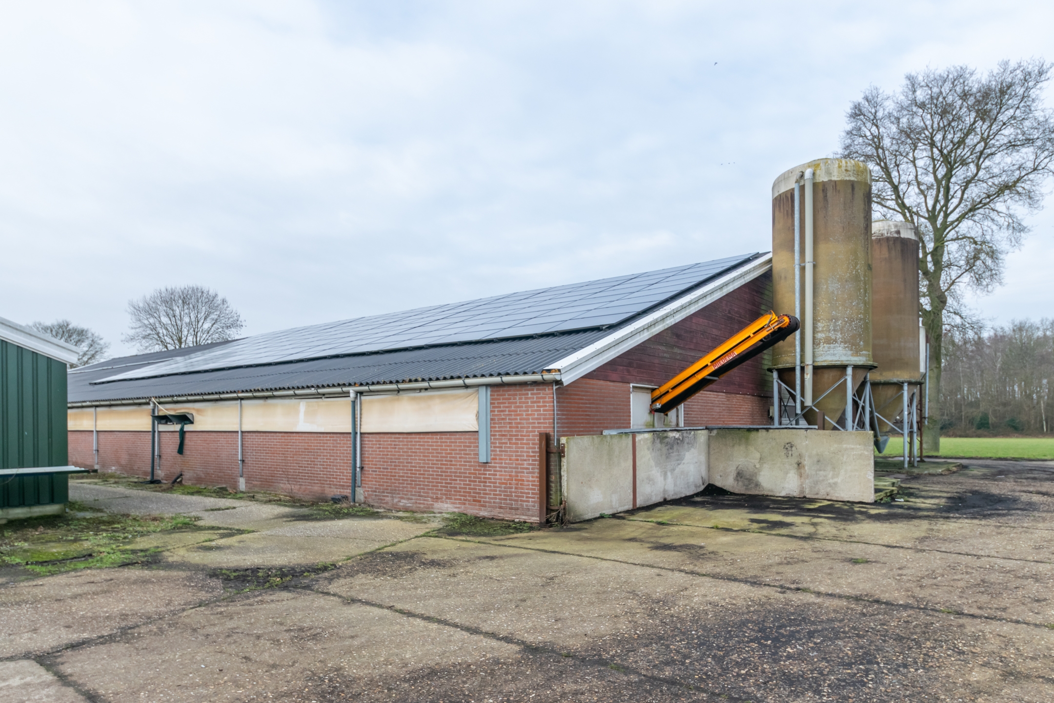 Aan de woning zijn diverse bedrijfsgebouwen gekoppeld met een totale oppervlakte van circa 1.364 m² op de begane grond, aangevuld met een zolderverdieping van circa 375 m² met een afmeting van circa 25 x 15 meter. De bebouwing bestaat onder meer uit een ligboxenstal, oorspronkelijk gebouwd in de jaren zeventig, met een afmeting van circa 31 x 20 meter en een goothoogte van circa 2,15 meter, alsmede gekoppelde groene schuren aan de achterzijde met een gezamenlijke oppervlakte van circa 374 m². De opstallen zijn de afgelopen jaren in gebruik geweest als wormenkwekerij en kunnen, afhankelijk van de wensen van de koper, weer als zodanig worden ingericht. Daarnaast zijn de schuren geschikt voor agrarisch gebruik, opslag of een onderneming passend binnen de geldende bestemming. De daken van de schuren zijn asbestvrij.