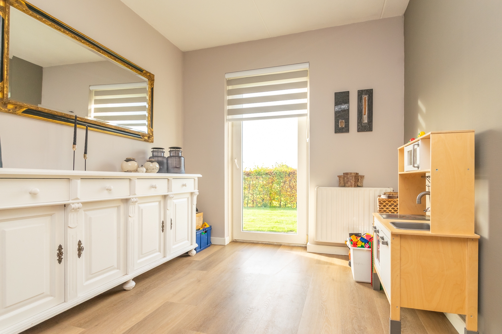 Indeling: Begane grond: hal – bijkeuken – kantoor – toilet – woonkamer – speelruimte – woonkeuken