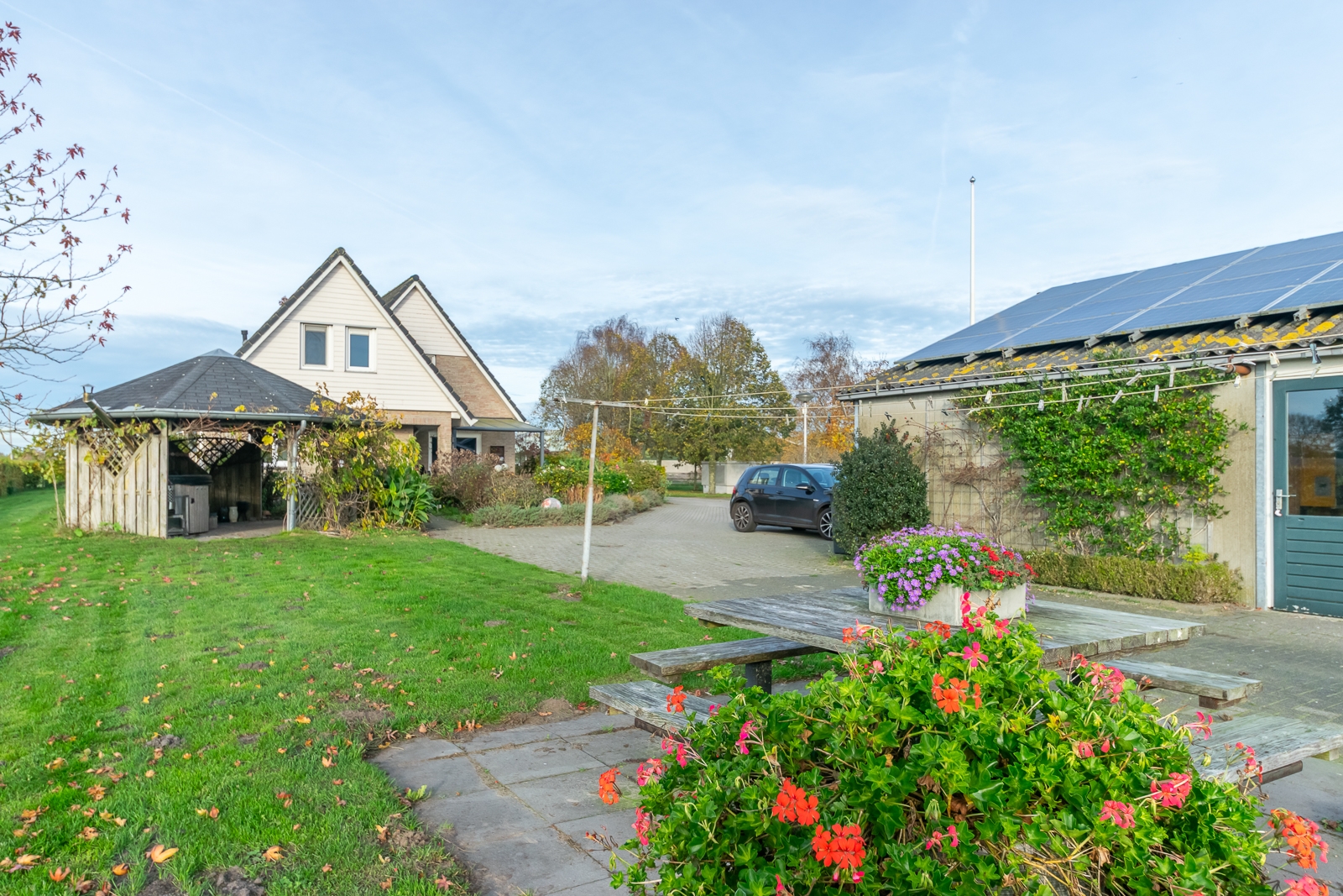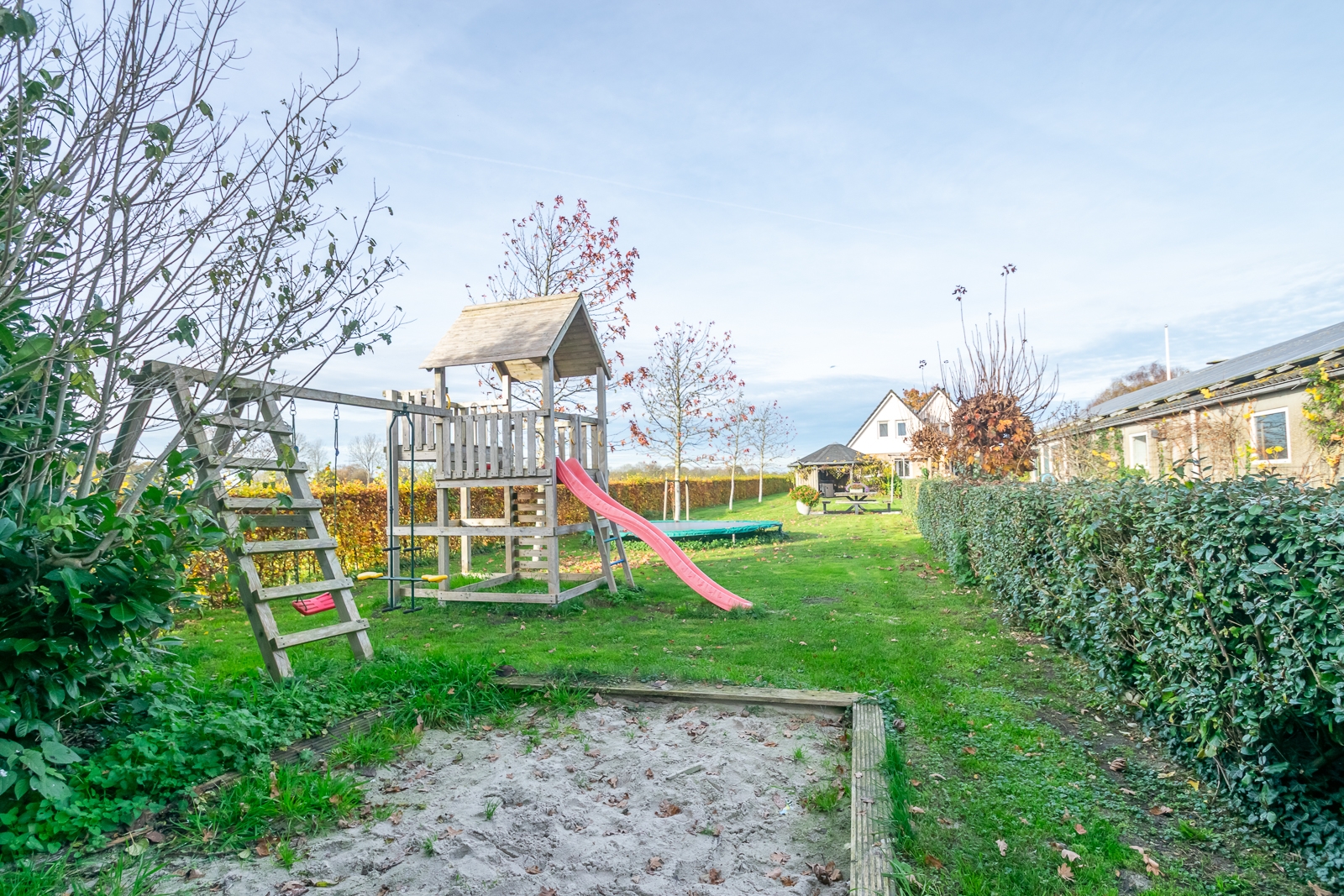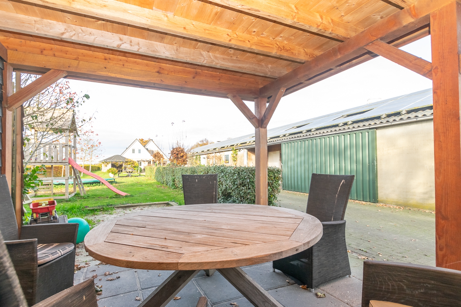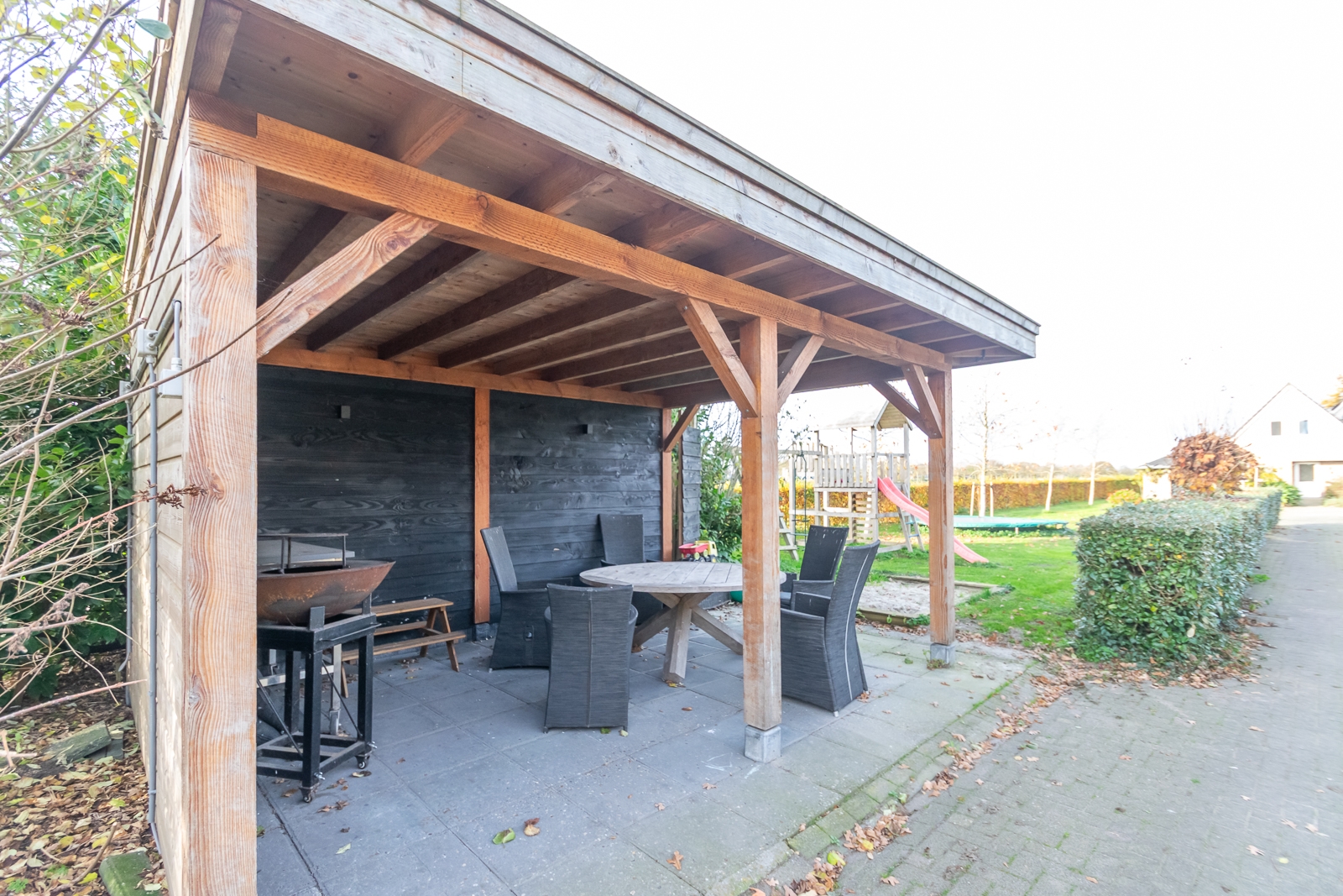 Overig: In de tuin staat een overkapping en achterin de tuin een tuinhuis met afmetingen van 5 m x 4 m, gebouwd van Douglas panelen.