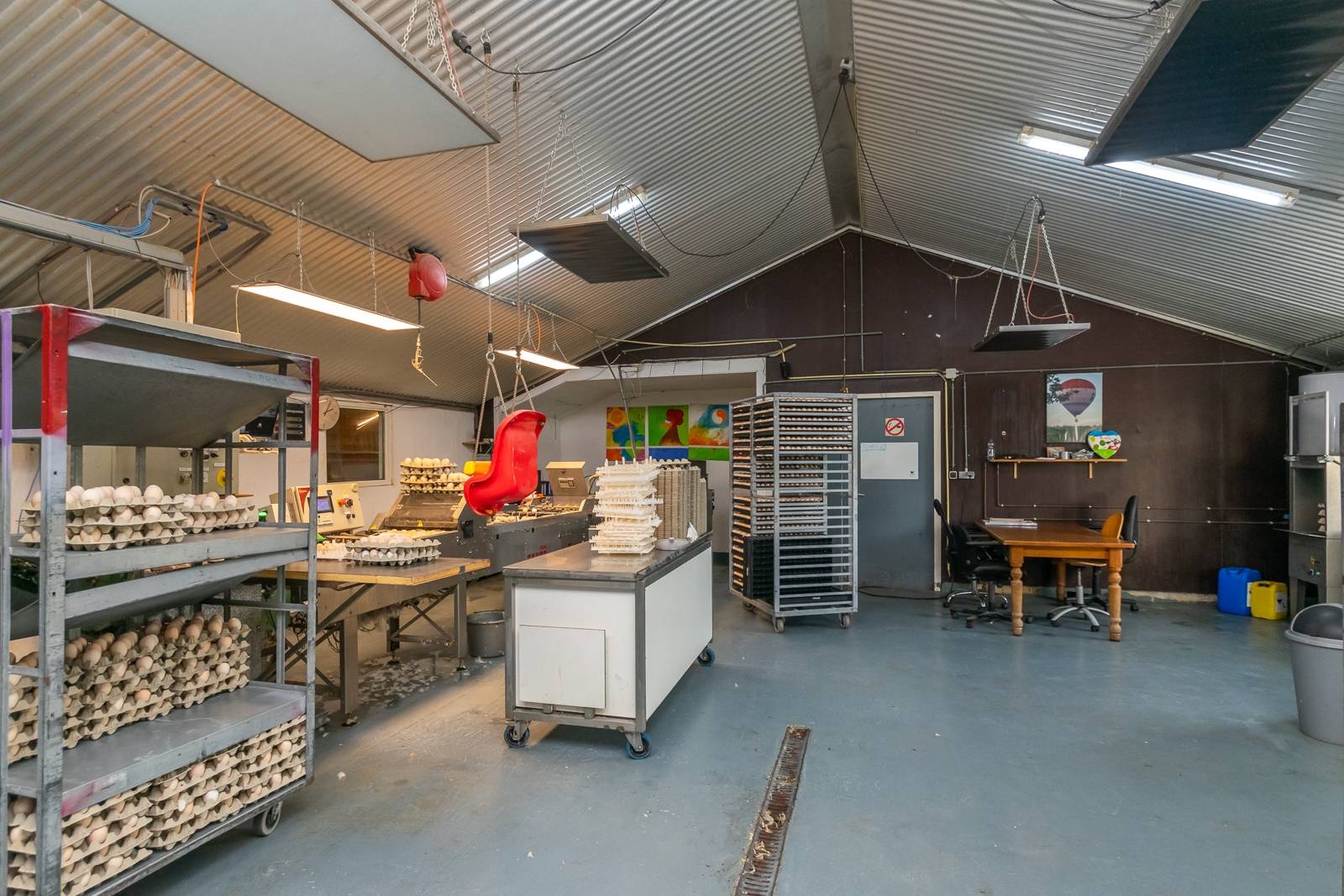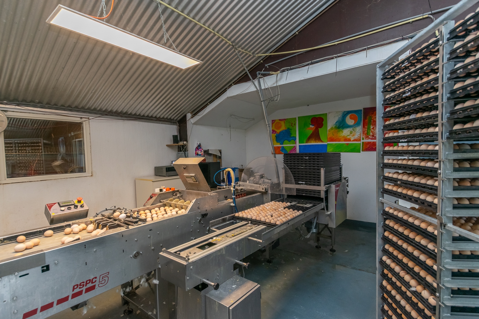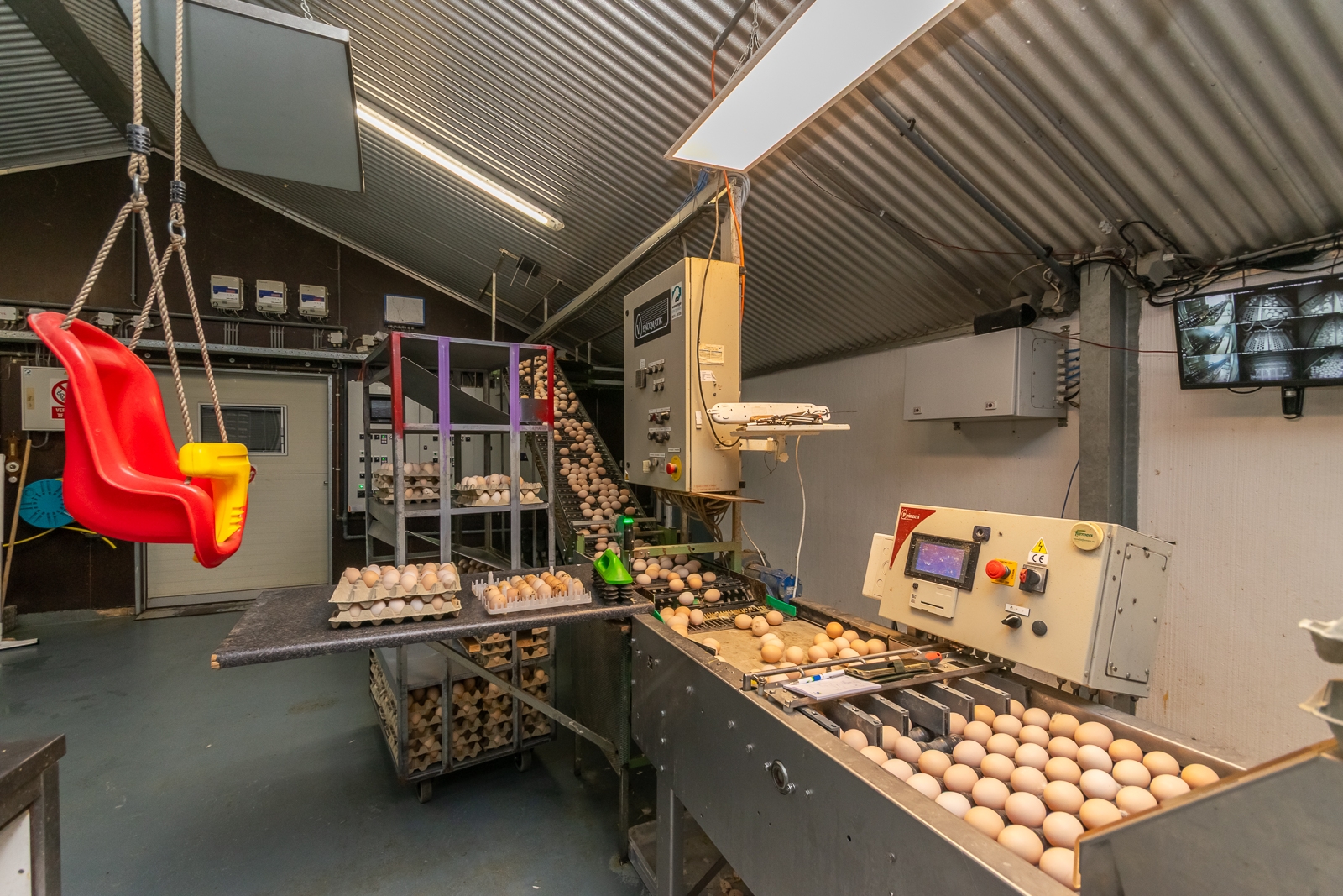 De eierinpakruimte met hygiënesluis naast de pluimveestallen heeft een afmeting van 10 m x 9 m. De eierbanden