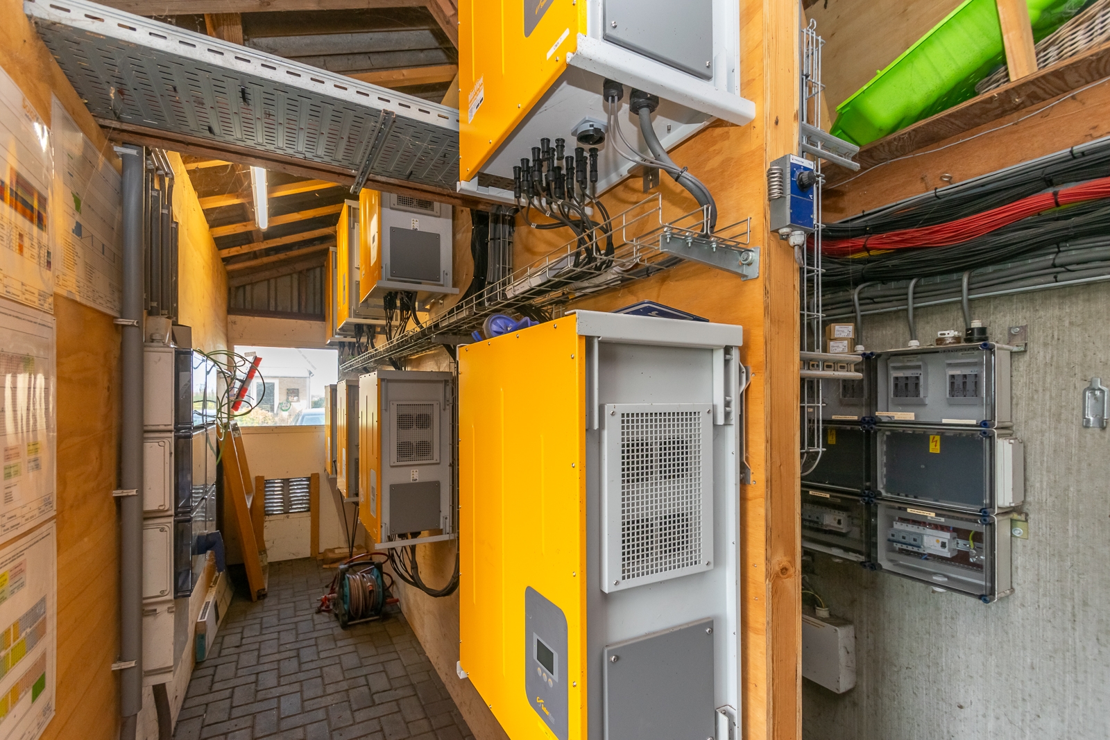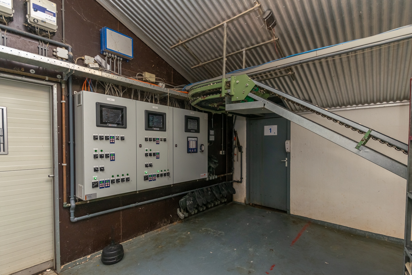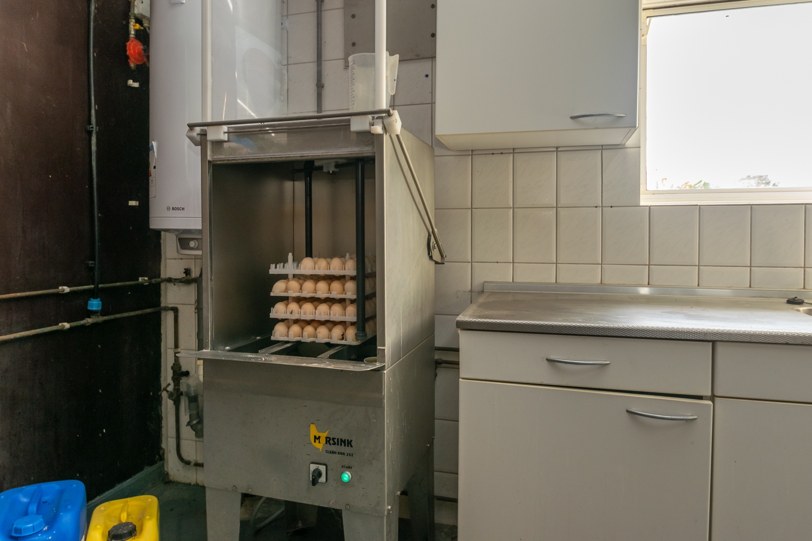 De eierinpakruimte met hygiënesluis naast de pluimveestallen heeft een afmeting van 10 m x 9 m. De eierbanden
