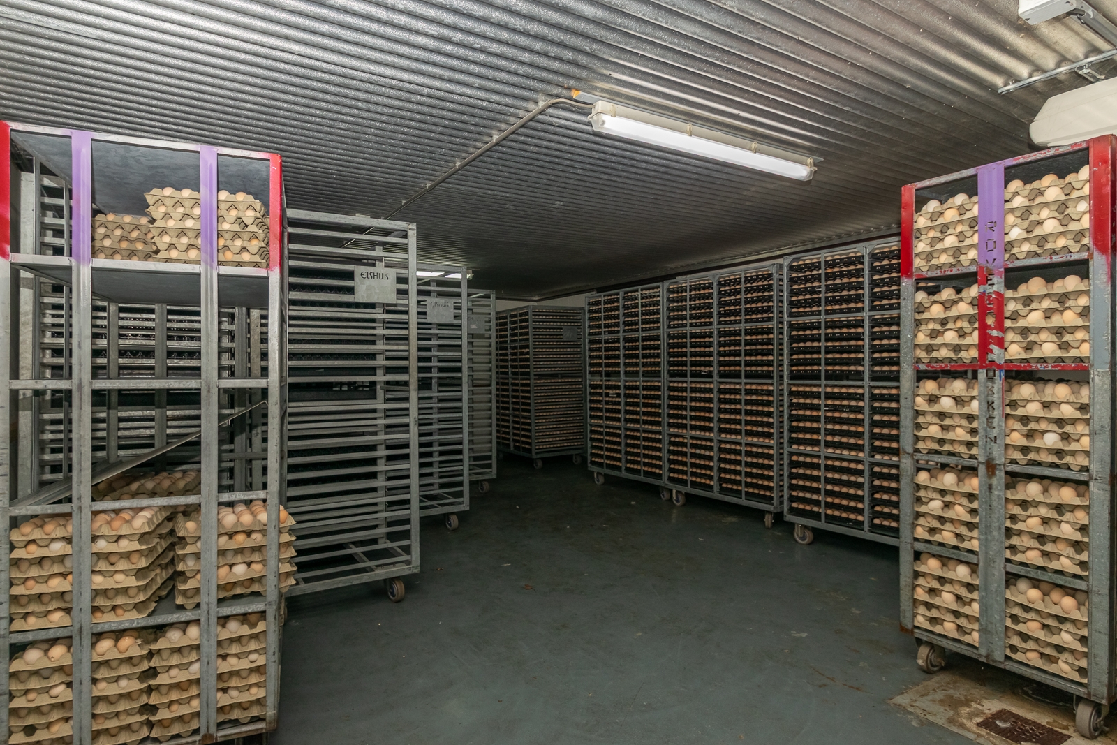 De eieropslagruimte heeft afmetingen van 7,5 m x 5 m. Geconditioneerd met een capaciteit van 130.000 eieren.
